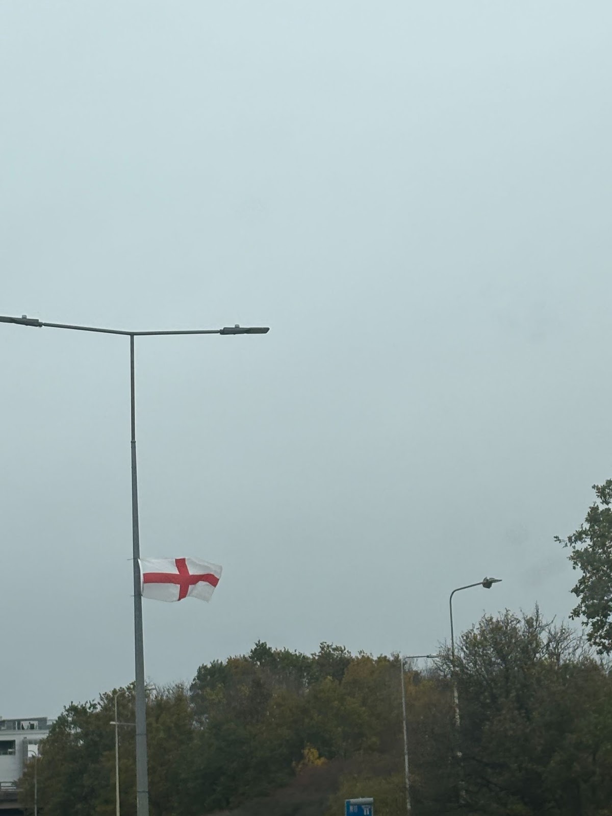 An English flag on a street light in Redbridge County. Photo by Lydie Udofia