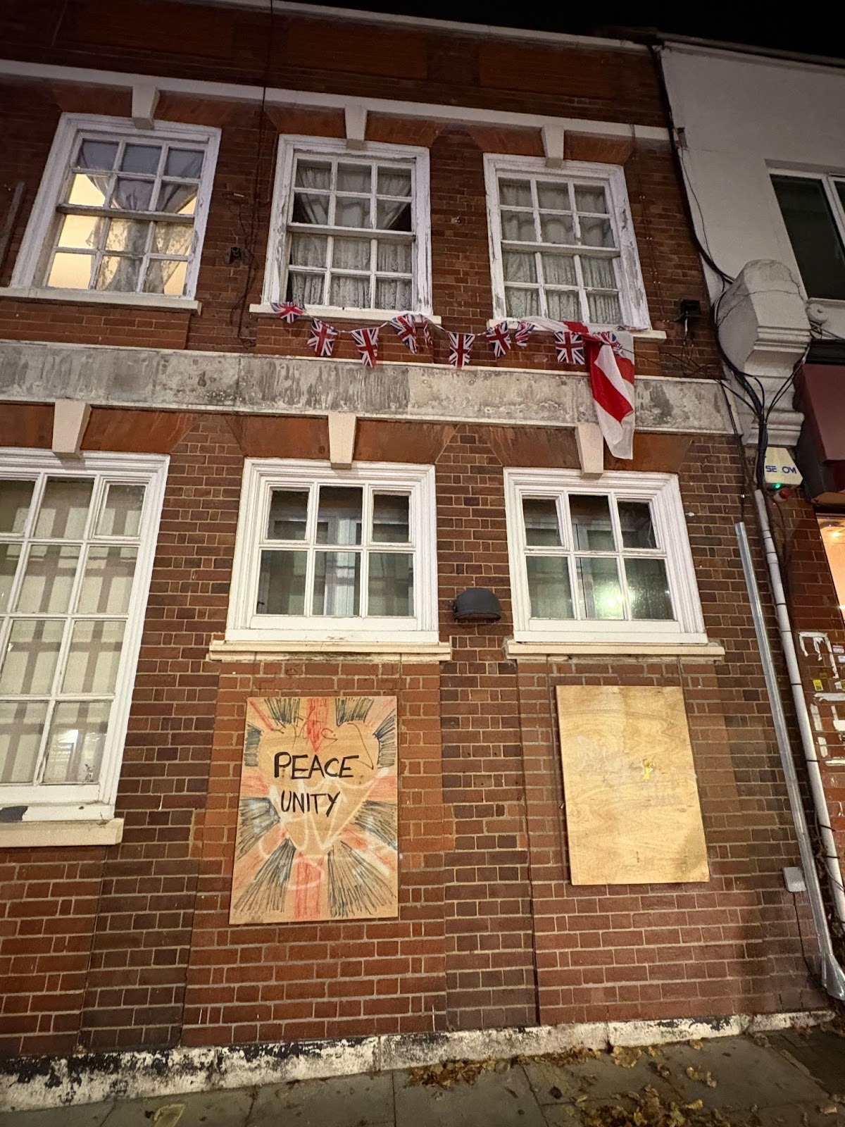 A display of English flags is hung above a Peace & Unity sign. Photo by Lydie Udofia.